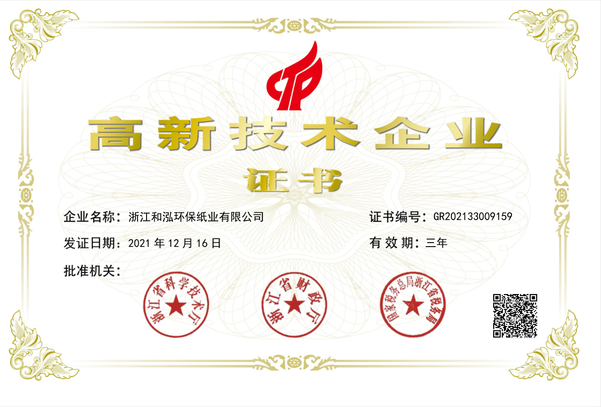 浙江和泓环保纸业有限公司顺利通过“高新技术企业”认定。
