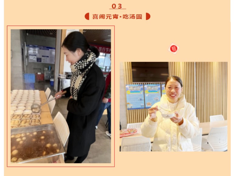 一颗颗雪白的汤圆纷纷“跳入”锅中,和红糖、酒酿一起煮,几分钟后,晶莹剔透的汤圆映入我们眼帘,大家迫不及待地品尝起来。吃一口汤圆,寓意团圆和美,希望每一位员工在品尝美味的同时日子越过越美满!