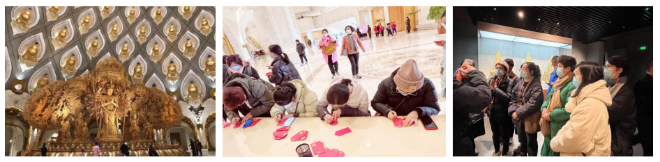 步入圣坛,大家被圣坛庄重典雅、宏伟壮观的气势所震撼。一楼圆通大厅更是美轮美奂,地面正中是千手观音佛像,跨度61.9米、高度23.7米的须弥山穹顶上260尊佛像布置在对应的镂空处,让人叹为观止。女神们走到心愿处,纷纷写下祈福卡,祈祷新的一年国泰民安、平安顺遂、身体健康。