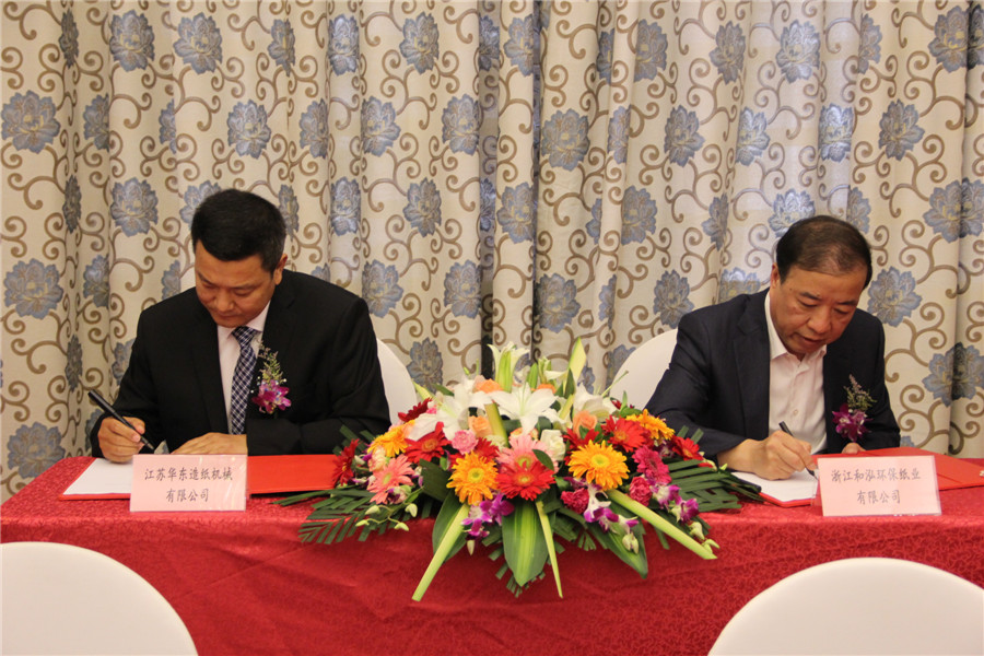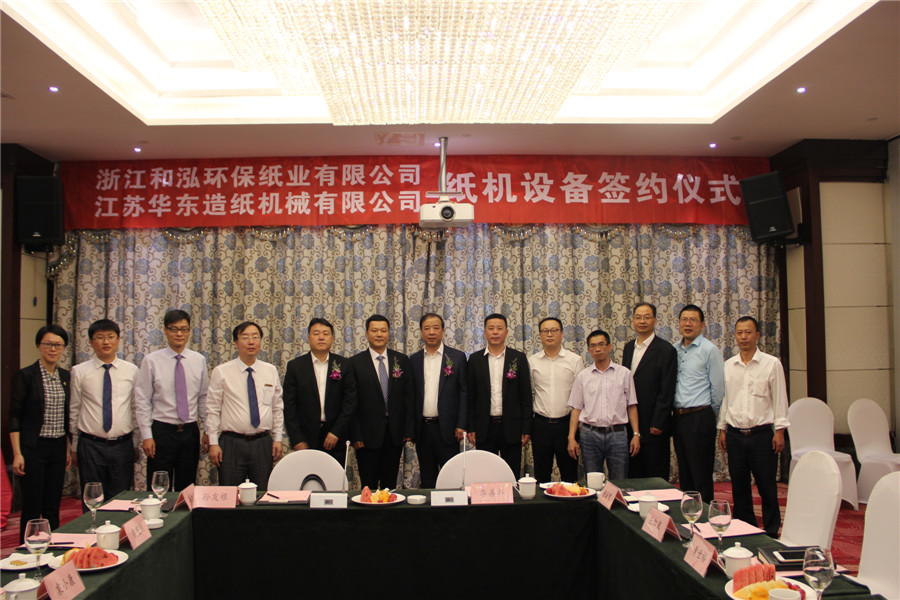 5月26日,浙江和泓环保纸业有限公司与江苏华东造纸机械有限公司纸机设备签约仪式在南洋酒店举行,双方就和泓环保纸业项目第一台大型生产设备——造纸机的采购和供应达成合约。本次签约象征和泓环保纸业项目正式启动!